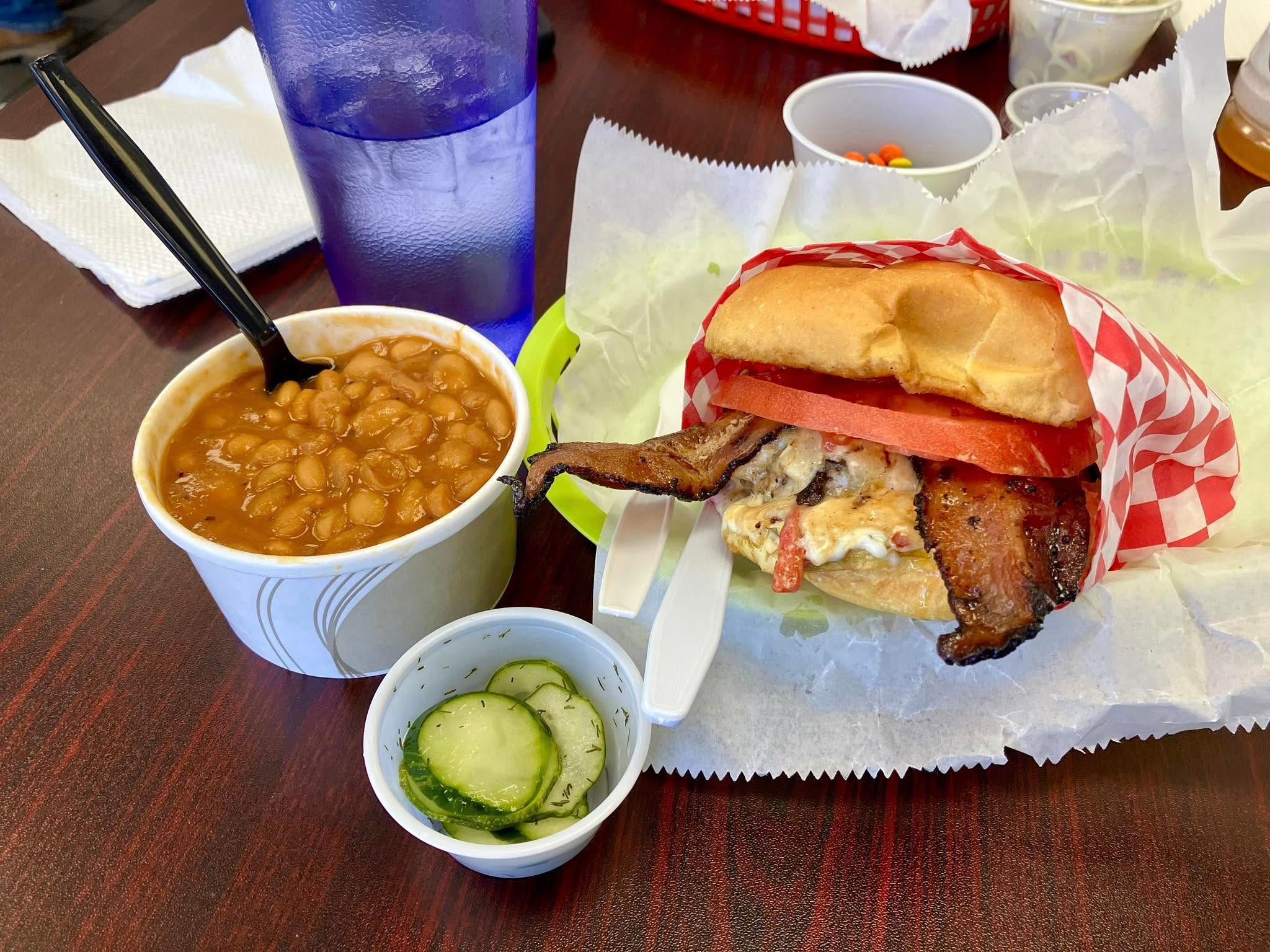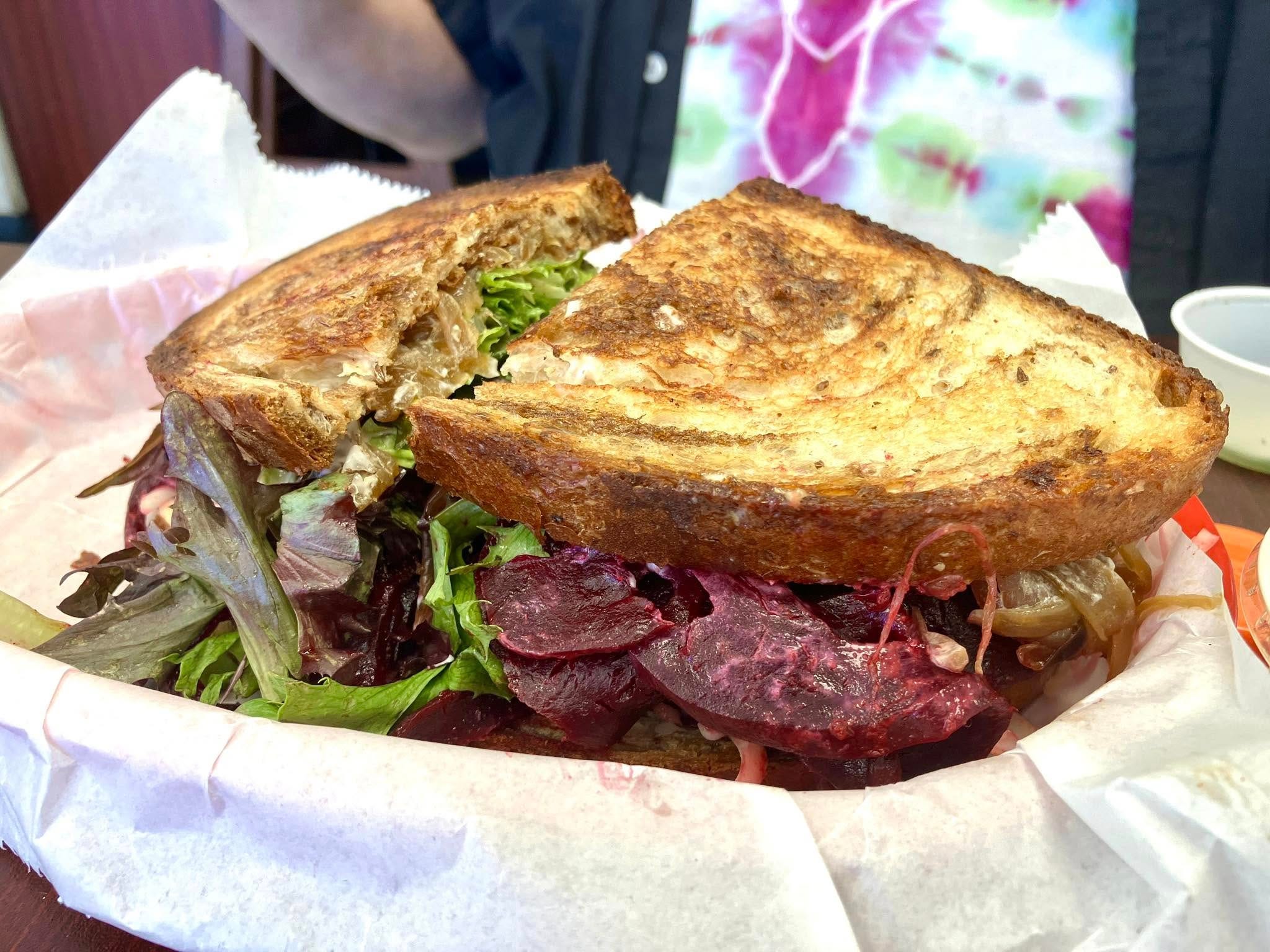 David got what he always gets, the beet sandwich. This thing is legendary, and everybody is always telling me that I have to try it, but when I get to Sand Hill, and there's two kinds of burgers, a fried chicken sandwich, and a Reuben standing between me and the one made out of beets... yeah. David enjoyed his beet sandwich very much.