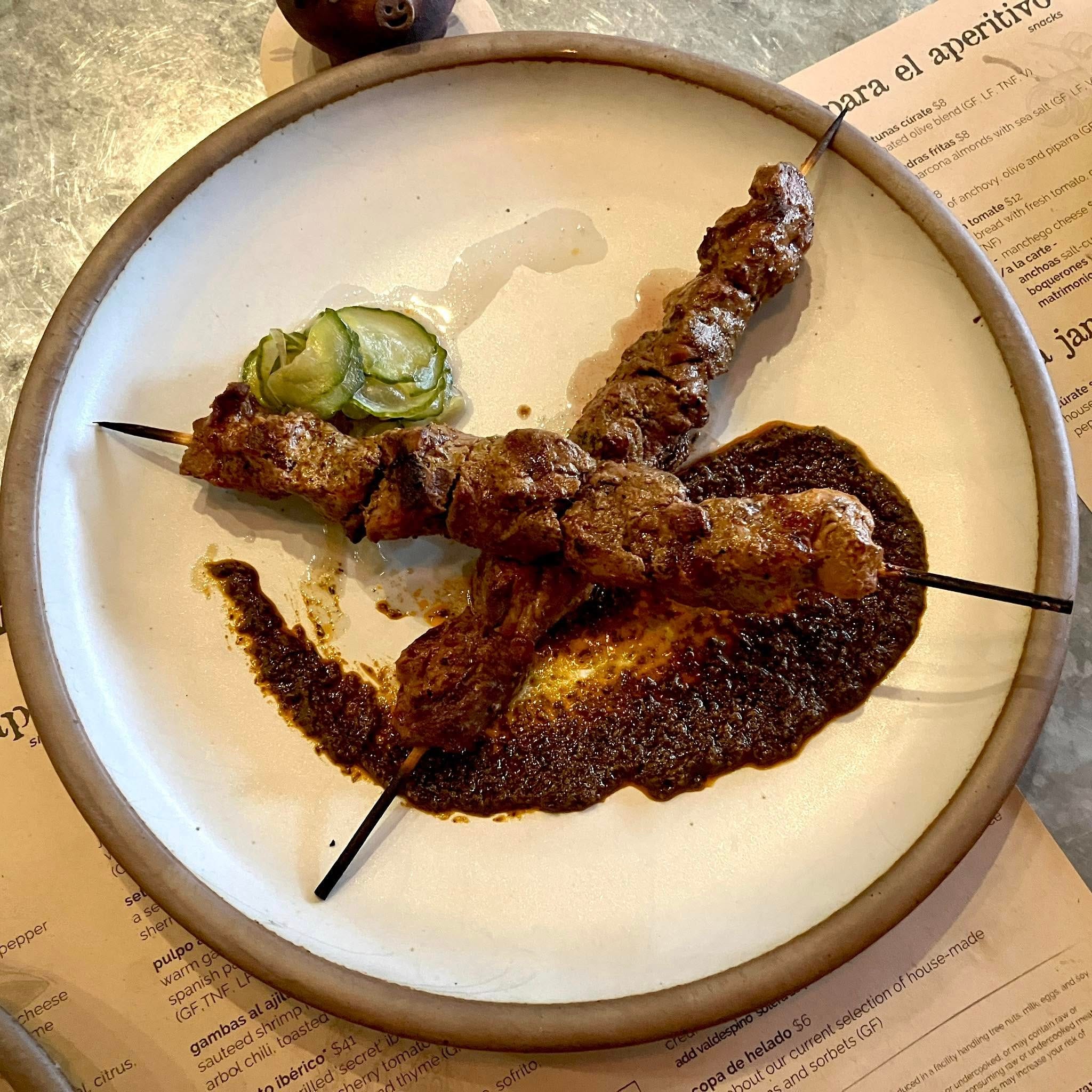 We shared two of our all-time Asheville favorites, that we've been eating at Cùrate since they first opened in 2011: The pan con tomate with Manchego cheese, and the pincho maruno aka lamb skewers. The bread with tomato and cheese and light, refreshing, and slightly punchy with the tang of the Manchego. The skewers are simply devine.